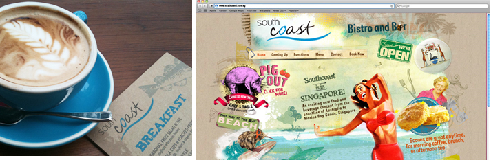 | Southcoast is here in Singapore! We helped bring to life this exciting new food and beverage concept from the coastline of Australia to Marina Bay Sands. Dishing out the restaurant logo, menus in specially-“krafted” material, matching paper bags and an uber cool website, the range of collateral showcases that Concept Lab’s creativity radar is not limited to just clean, corporate design. |